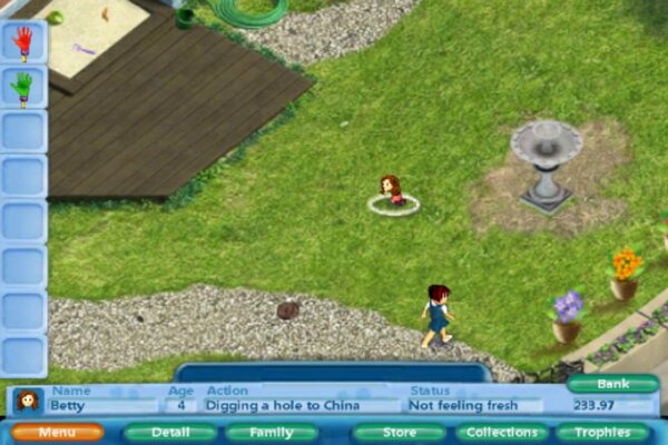 Virtual Families is a casual family sim that runs in true-real time. If they are dirt patches you need a rock hound certificate because you can dig up minerals they are collectibles but actual holes.